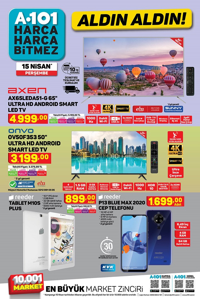 A101 market 15 Nisan 2021 aktüel ürünler kataloğu detayları belli oldu. A101 markette bu hafta Perşembe günü neler var? Sorusu yanıt buldu. A101 marketlerinde bu hafta Axen AX65LEDA51-G 65” Ultra Hd Android Smart Led Televizyon: 4.999,00 TL, Onvo OV50F353 50″ 50” Ultra Android Smart Led Televizyon: 3.199,00 TL ve Seg SNF-5200 No Frost Buzdolabı: 2.999,00 TL’den satışa çıktı. A101’de Reeder P13 Blue Max 2020 64GB Cep Telefonu: 1.699,00 TL, Seg CM 580 5 KG Çamaşır Makinesi: 1.499,00 TL, Reeder M10S Plus Tablet: 899,00 TL ve Samsung Cyclone VC07R302MVB/TR Süpürge: 649,00 TL’den satılıyor.