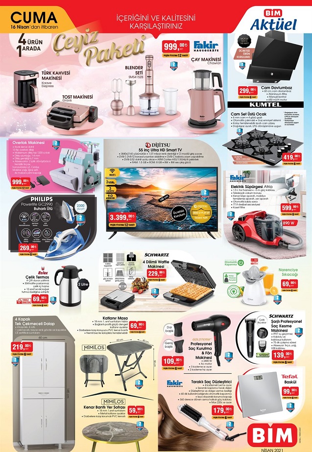 BİM market 16 Nisan 2021 Cuma aktüel ürünler kataloğu listesi belli oldu. Bim markete bu hafta gelecekler neler var sorusu yanıt buldu. BİM marketlerinde bu hafta Dijitsu 55 inç Ultra HD Smart Televizyon 3.399,00 TL, Simfer 6 Çekmeceli Derin Dondurucu S6210 1.999,00 TL ve Keysmart Buzdolabı 1.799,00 TL fiyatı ile satışa çıkacak. Güral Porselen 57 Parça Yemek Takımı 1.099,00 TL, Fakir 4 Ürün 1 Arada Çeyiz Paketi 999,00 TL, Overlok Makinesi 999,00 TL ve Soley 8 Parça Çeyiz Seti 799,00 TL’den satılacak. BİM’de Fakir Elektrik Süpürgesi Atria 599,00 TL, Benzinli Ağaç Kesme Motoru 499,00 TL, Kumtel Cam Set Üstü Ocak 419,00 TL ve Perilla Çok Amaçlı Akrobatik Merdiven 399,00 TL’den satışa sunulacak.
