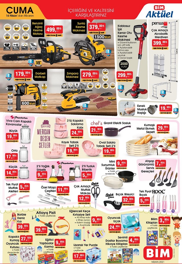 BİM marketlerinde 16 Nisan Cuma günü Sunta Kesme Makinesi 379,00 TL, Kumtel Cam Davlumbaz 299,00 TL, Kablosuz İpli Kenar Otu Kesme Makinesi 299,00 TL ve Zımpara Makinesi 279,00 TL’den satılacak. Hisar Optima 30 Parça Çatal Kaşık Bıçak Takımı 279,00 TL, Philips Buharlı Ütü 269,00 TL, Hisar Optima 6 Parça Çelik Tencere Seti 269,00 TL ve Bahariye Halı Püsküllü 160×230 cm 259,00 TL’den satılacak. Schwartz 4 Dilimli Waffle Makinesi 229,00 TL, 4 Kapak Tek Çekmeceli Dolap 219,00 TL, LAVA Döküm Tencere 24 cm 199,00 TL ve Bambu Yorgan Çift Kişilik 189,00 TL’den satılacak.