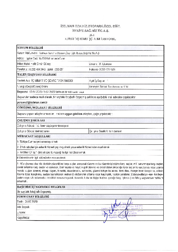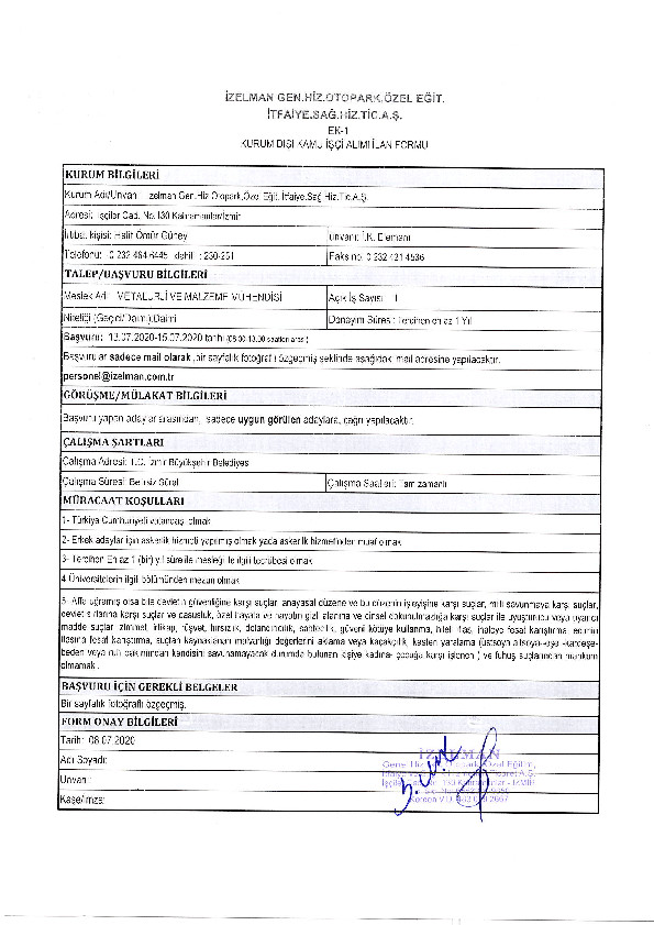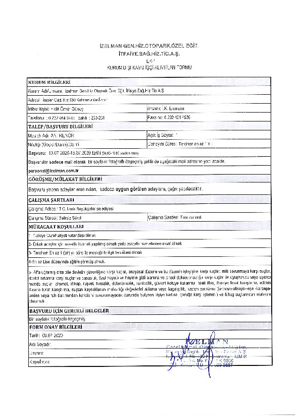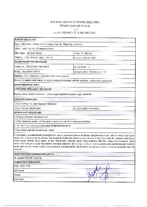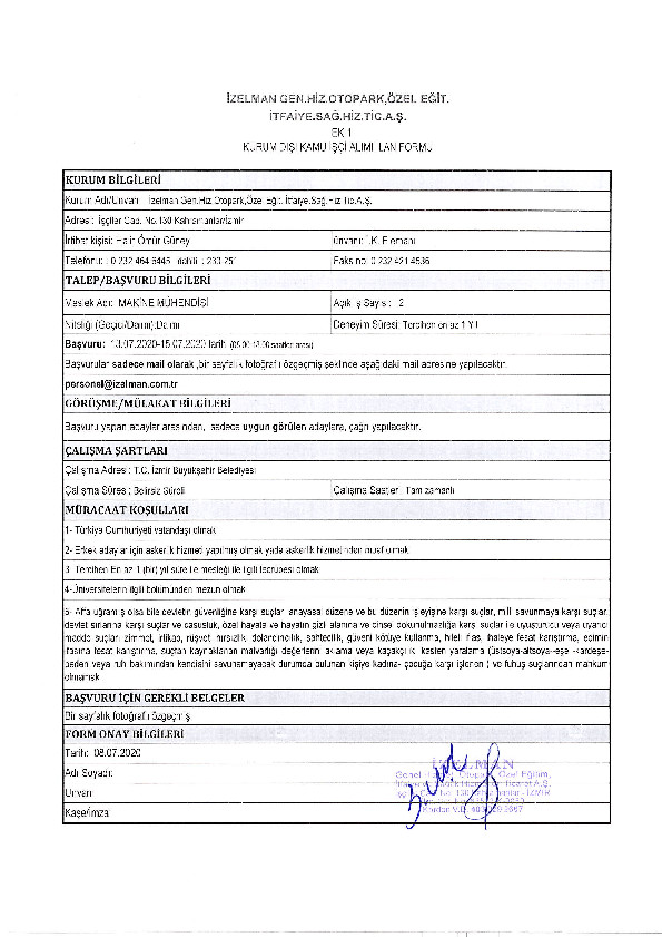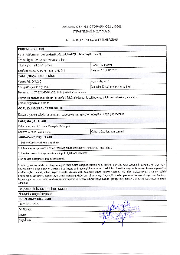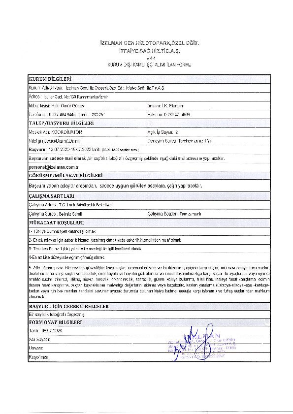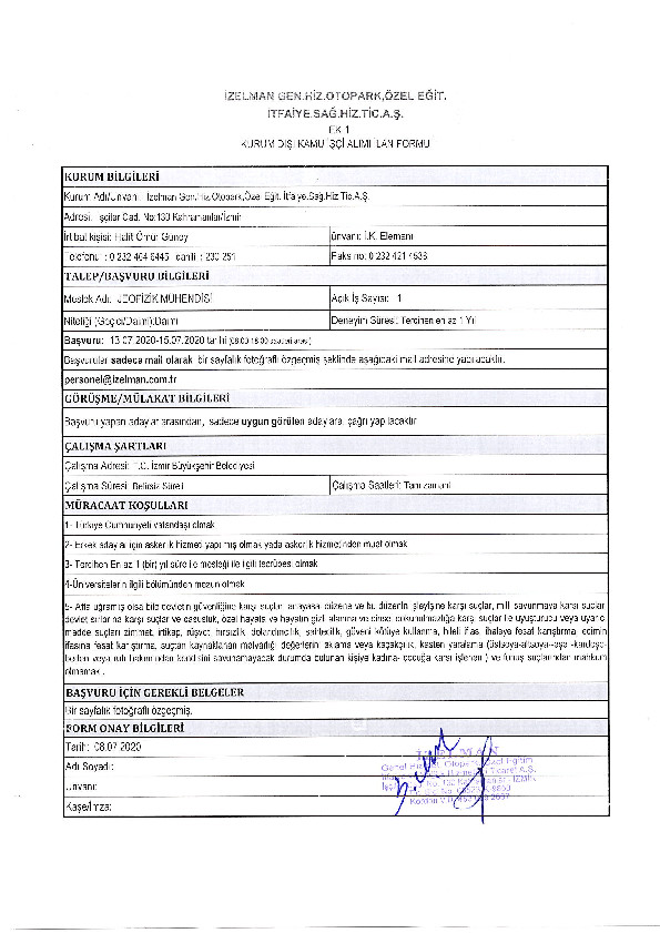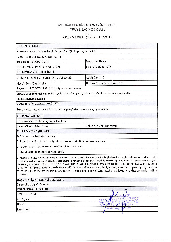 İzmir Büyükşehir Belediyesi şirketlerinden İZELMAN, personel alımı başlattı. İZELMAN’dan İŞKUR’a gönderilen işe alım duyurusunda 9 farklı meslekten 13 kişinin işe alımının gerçekleşeceği kaydedildi. Başvuruların 13 Temmuz 2020 Pazartesi günü saat 08.00’de başlayacağı, 15 Temmuz 2020 Çarşamba günü 18.00’de sona ereceği ifade edildi. İş ilanlarına başvurular, [email protected] adresine mail yoluyla gerçekleştirilecek. Uygun görülen adaylar, başvuruların sona ermesinin ardından mülakata çağrılacak.