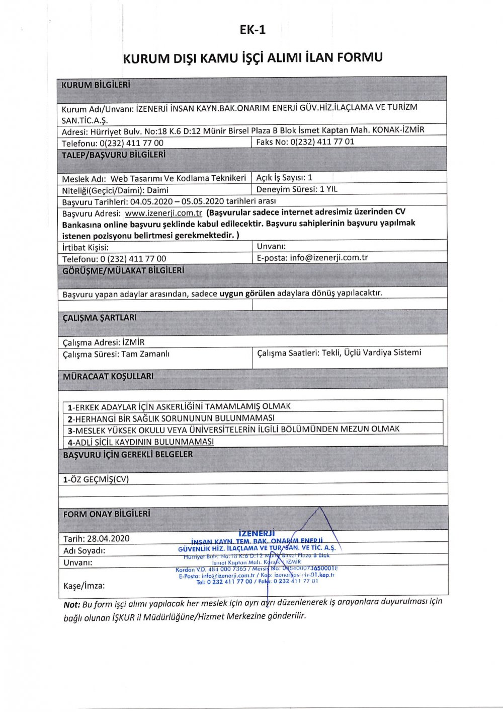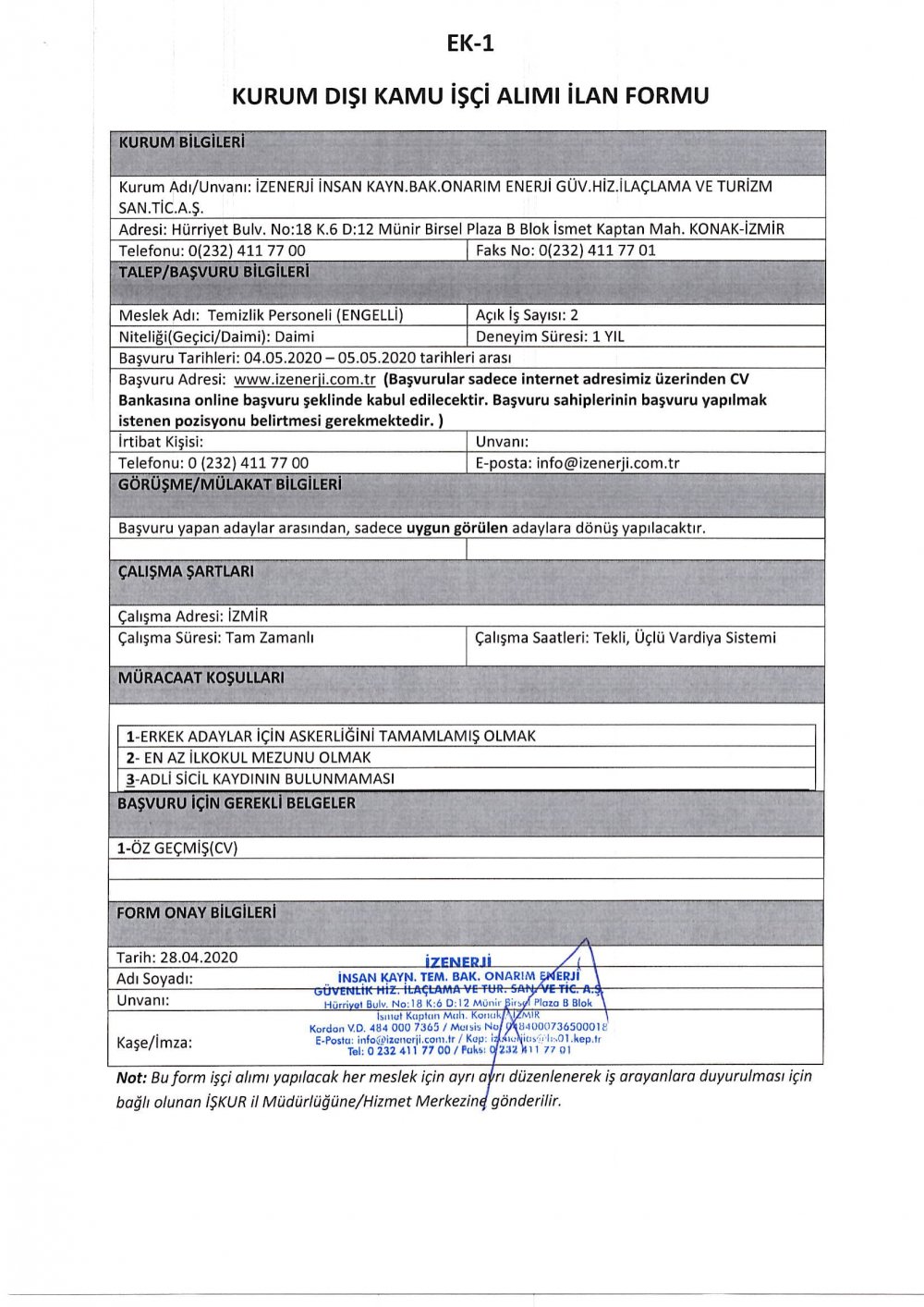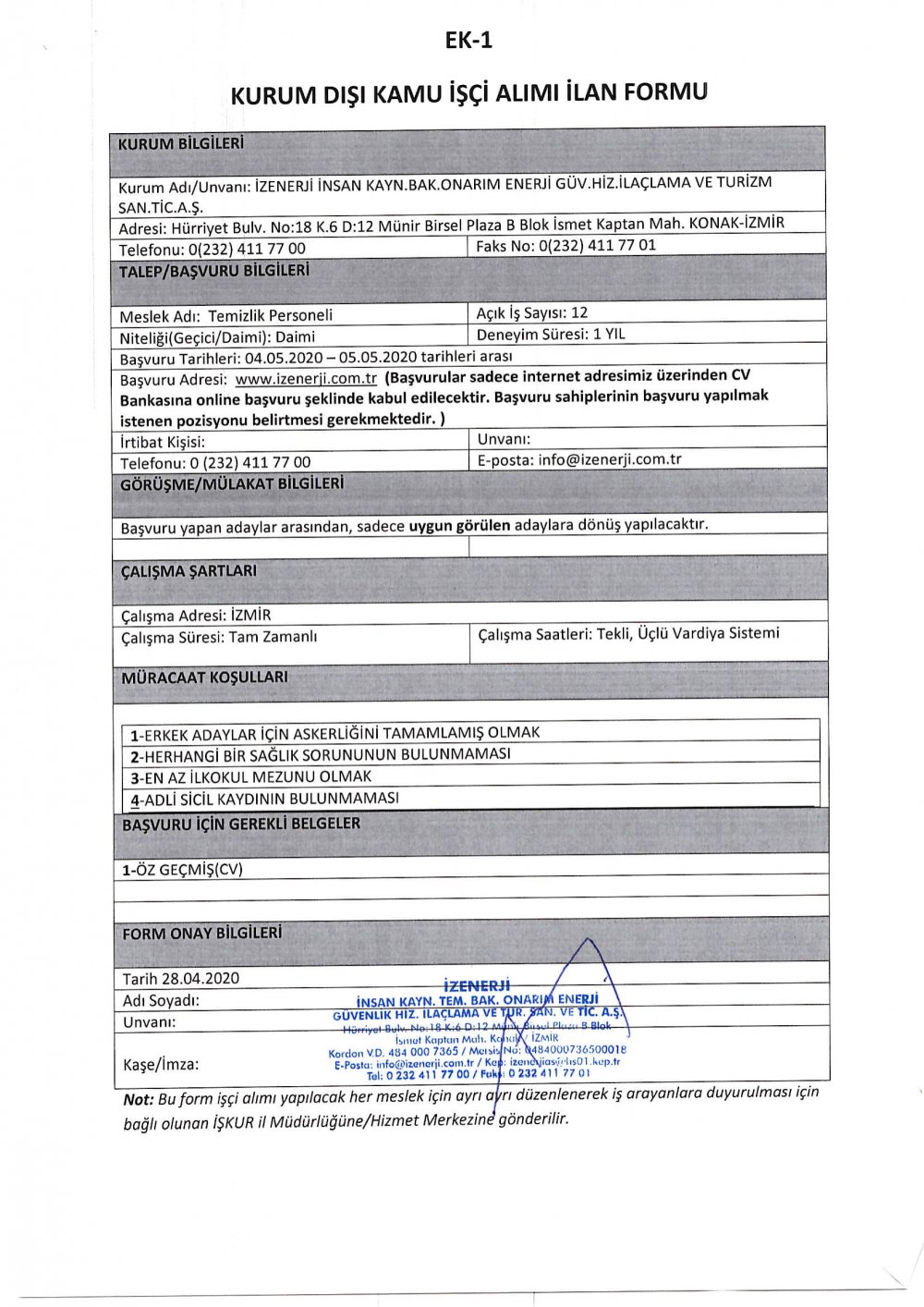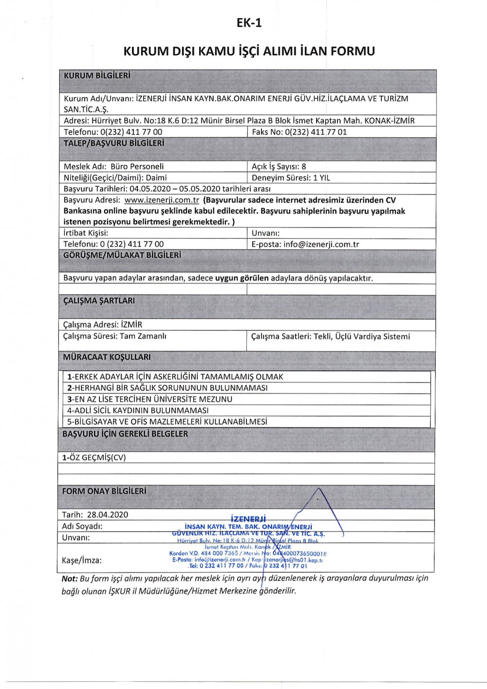 İZENERJİ’nin ilanına göre personel alımı yapılacak iş kolları ve alınacak personel sayısı şu şekilde: