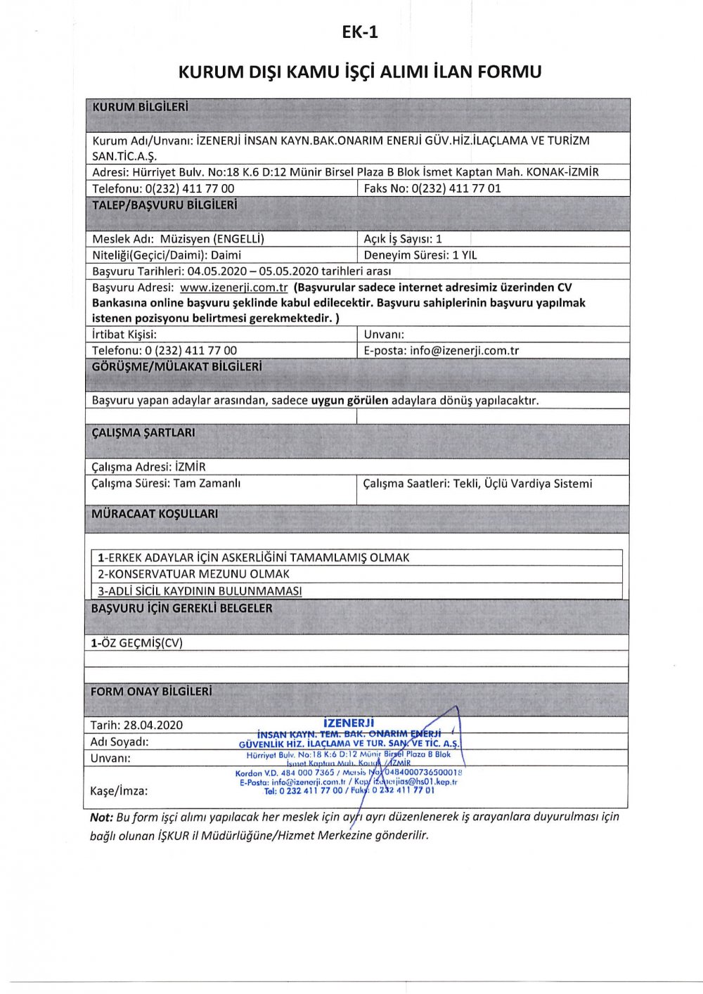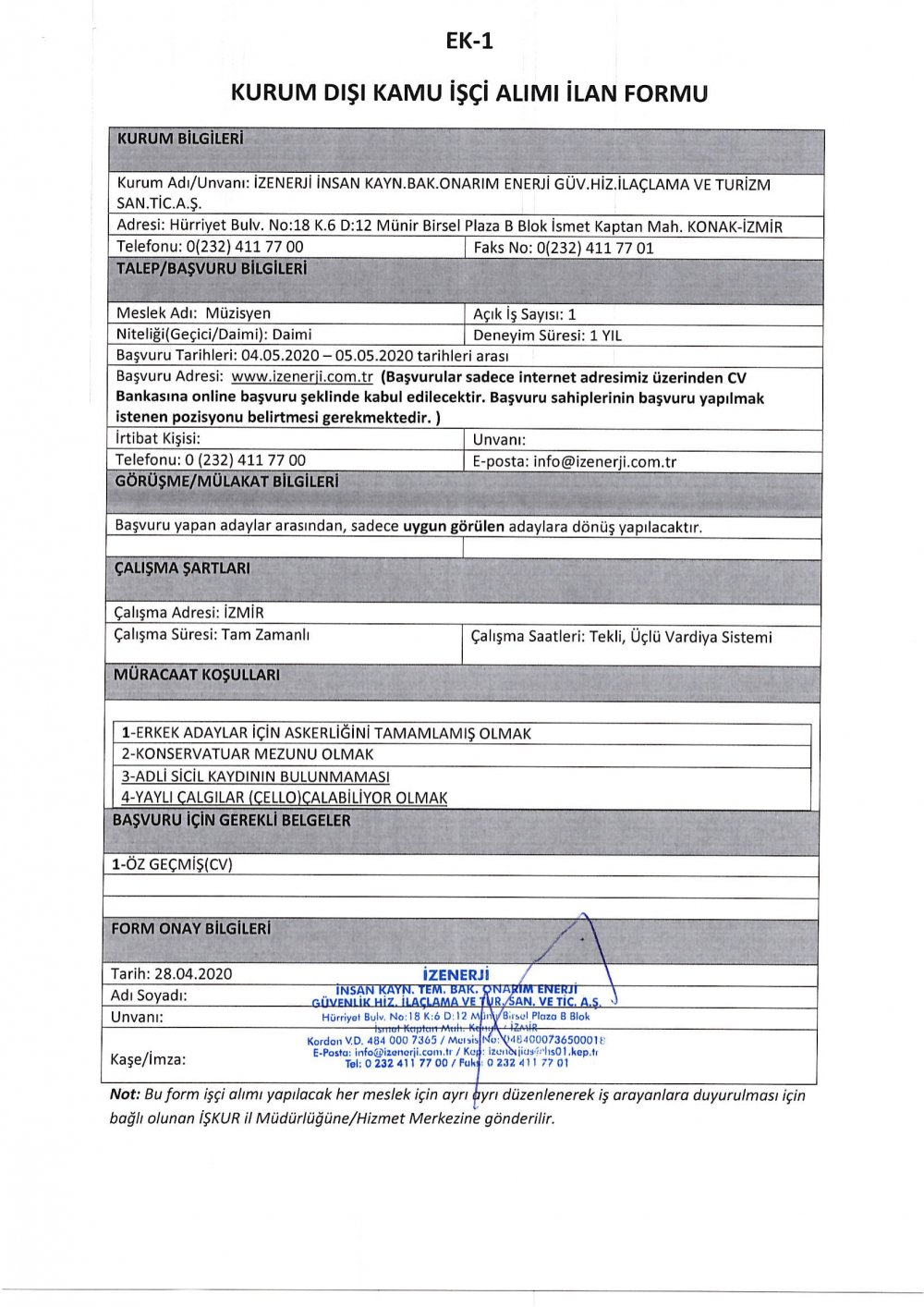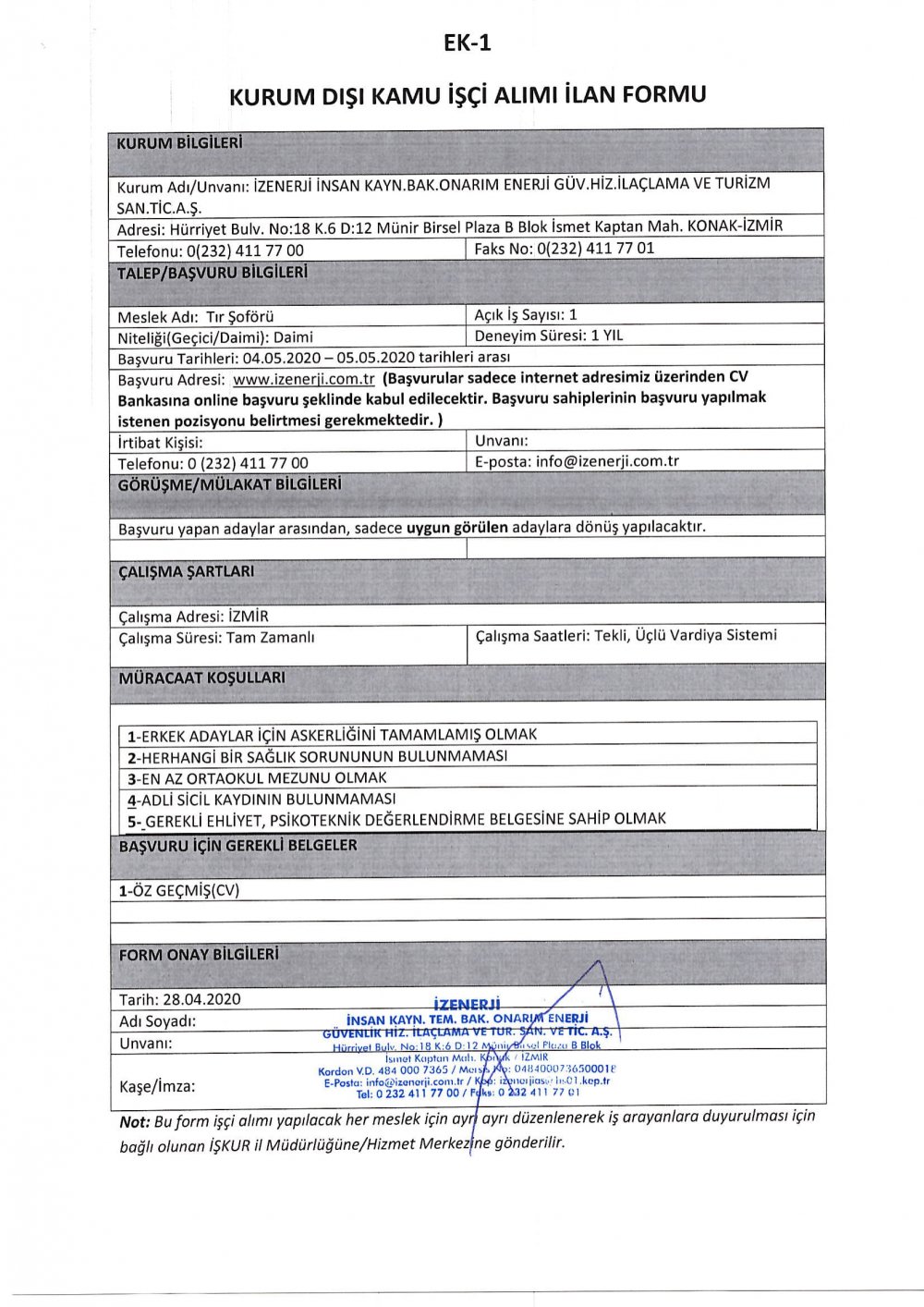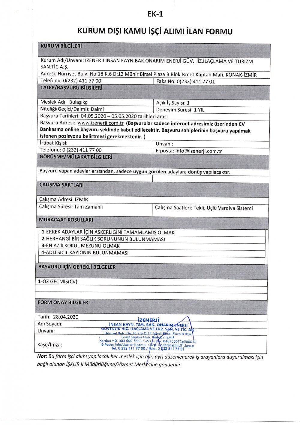 İZENERJİ’nin ilanına göre personel alımı yapılacak iş kolları ve alınacak personel sayısı şu şekilde: