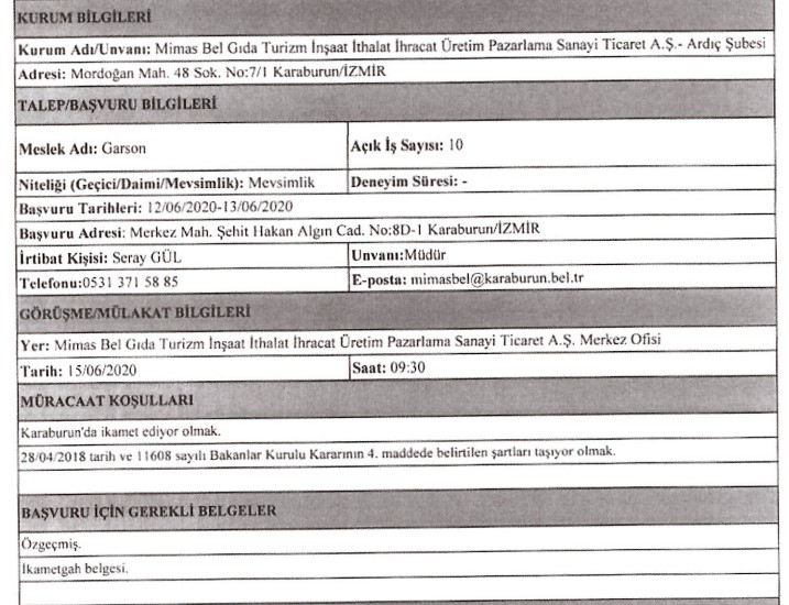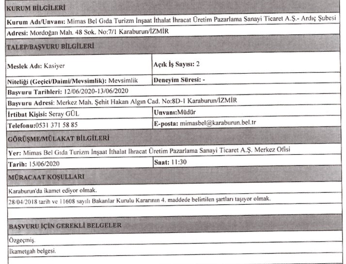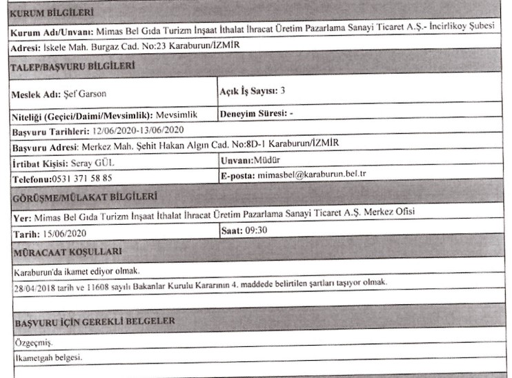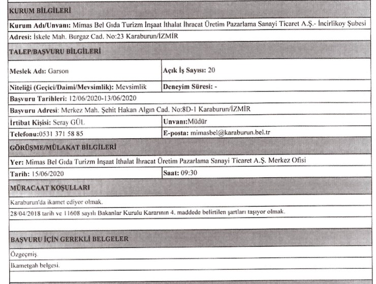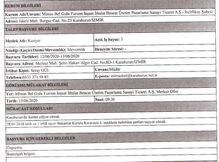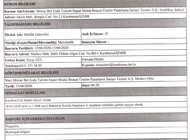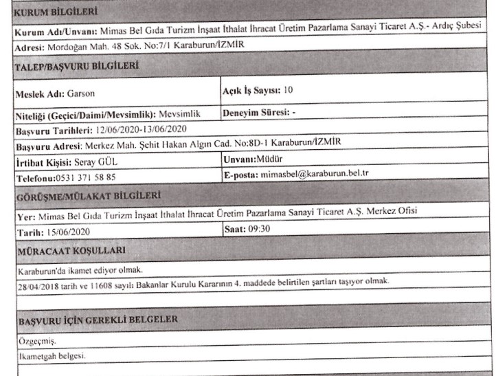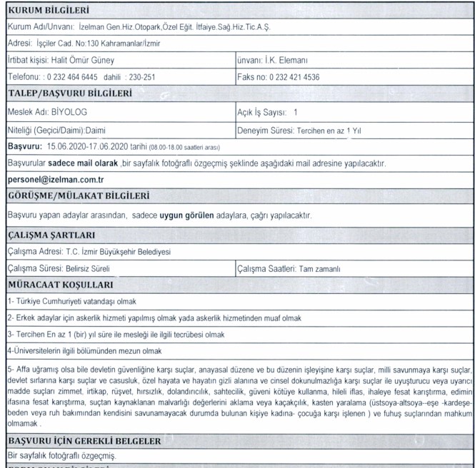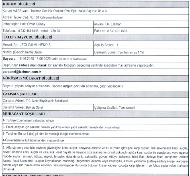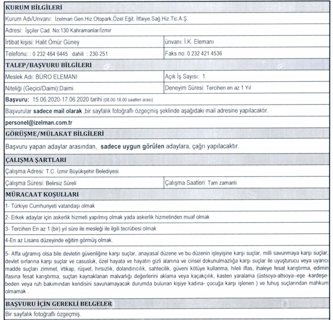 İzmir Büyükşehir Belediyesi iştiraklerinden İzdoğa, İzelman, İBB Grandplaza’nın yanı sıra Biyotıp ve Genom Merkezi ile Karaburun Belediyesi, 30 iş kolundan 89 personel alımı için ilan açtı. Başvuruların bir kısmına başvurular bugün sona erecek, bazıları ise 15 – 16 Haziran tarihinde başlayacak. İŞKUR’da yayınlanan ilanda, başvuru yapacak kişilerin nasıl başvuracağı ve hangi niteliklere sahip olması gerektiği de ifade edildi. İŞKUR’da yayınlanan ilanlar, son başvuru tarihleri ve tüm detaylar, haberimizde…