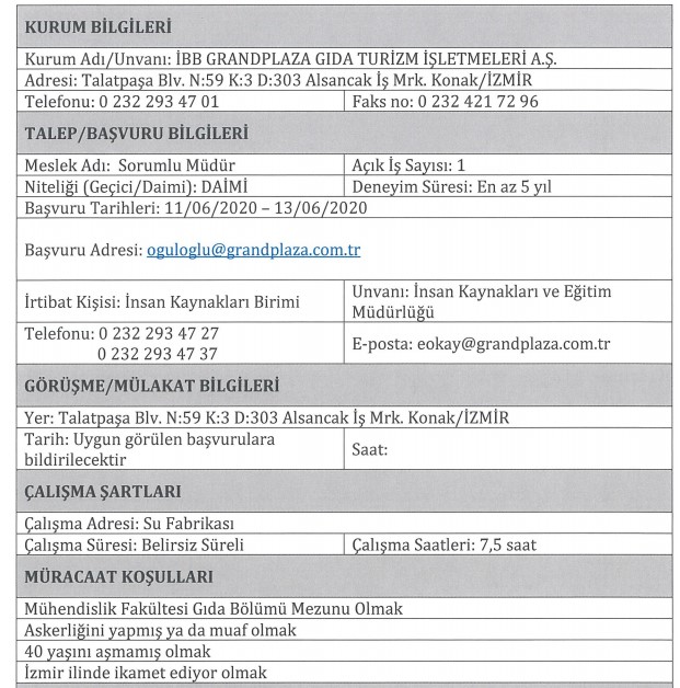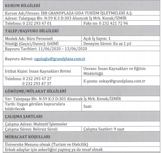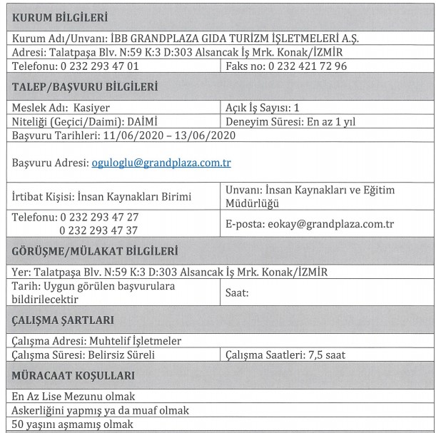 İBB GRANDPLAZA PERSONEL ALIMI