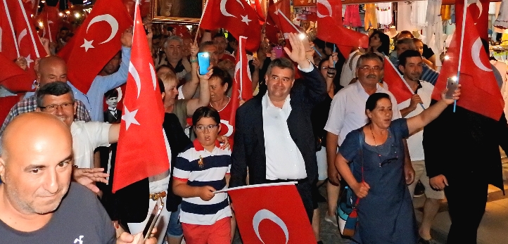 Çeşme çarşısında fener alayı yürüyüşüne katılan Çeşmeliler, marşlar eşliğinde yürüdü. Türk bayrakları coşkuyla sallanırken, cep telefonu ışıkları da akşamı aydınlattı. Çeşme çarşısından başlayan yürüyüş Cumhuriyet Meydanı’na kadar devam etti. Konser etkinliğinin yapılacağı sahneye çıkan Çeşme Belediye Başkanı Ekrem Oran, meydandaki kalabalığı selamladı. 31 Mart gecesinde de böyle bir kalabalık gördüğünü kaydeden Başkan Oran, 31 Mart gecesi kadar güzel bir gece olduğunu söyledi.