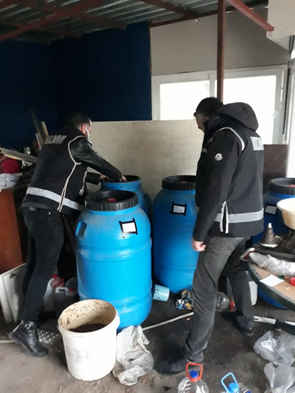Zanlı F.K.’nın takibine devam eden ekipler, boş bir arazide bulunan konteynırın önüne geldiğinde kendisini durdurdu. Konteynırda ikamet ettiği öğrenilen F.K.’nın kaldığı yerde arama yapıldı. 3 adet 200 litre, 1 adet 100 litrelik plastik variller içinde toplam 700 litre şarap, 2 adet plastik damacana içinde 15 litre viski, 2 adet plastik damacana içinde 25 litre rakı ve alkol imalatında kullanılan ısıtıcılı krom kazan ve bakır boru tertibatı ele geçirildi. Zanlı F.K. gözaltına alınarak emniyete götürüldü.