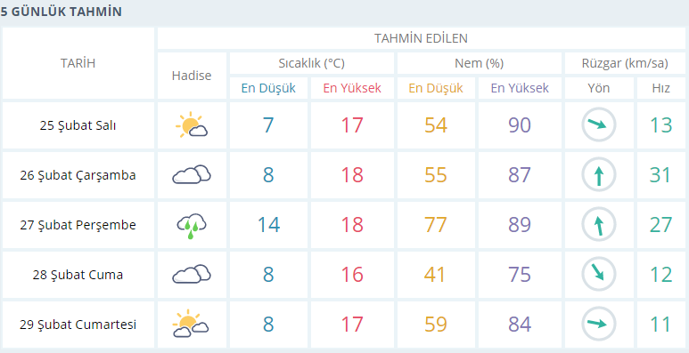 - 25 Şubat Salı – Az bulutlu | En düşük 7, en yüksek 17