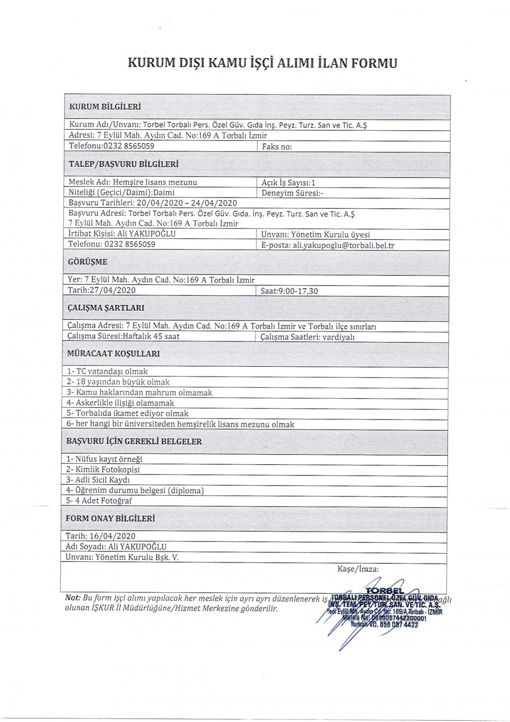 İzmir Torbalı Belediyesi’nin personel alımı işlerini yapan TORBEL tarafından İŞKUR’da açılan iş ilanına göre Torbalı Belediyesi’ne Lisans Mezunu olan 1 hemşire alınacak. Başvuru tarihleri 20 Nisan 2020 Pazartesi ile 24 Nisan 2020 Cuma günleri arasında olacak. Daimi olarak alınacak personelde deneyim süresi şartı aranmıyor. Torbalı Belediyesi iş ilanı için başvuru; Torbel Torbalı Pers. Özel Güv. Gıda İnş. Peyz. Turz. San ve Tic. A.Ş. 7 Eylül Mahallesi Aydın Caddesi No: 169 A Torbalı / İzmir adresinde TORBEL yetkilisi Ali Yakupoğlu’na yapılacak. İş için görüşmelerin aynı adreste 27 Nisan 2020 tarihinde saat 09.00 ile 17.30 arasında yapılacağı duyuruldu. Çalışma şartları olarak; İzmir’in Torbalı ilçesi sınırları içinde vardiyalı olarak haftada 45 saat çalışma yapılacağı kaydedildi. Müracaat koşulları arasında herhangi bir üniversiteden hemşirelik lisans mezunu olmak, Torbalı ilçesinde ikamet ediyor olmak gibi şartlar var. Başvuru için gerekli belgeler arasında ise nüfus kayıt örneği, kimlik fotokopisi, adli sicil kaydı, öğrenim durumu belgesi (diploma) ve 4 adet fotoğraf var.