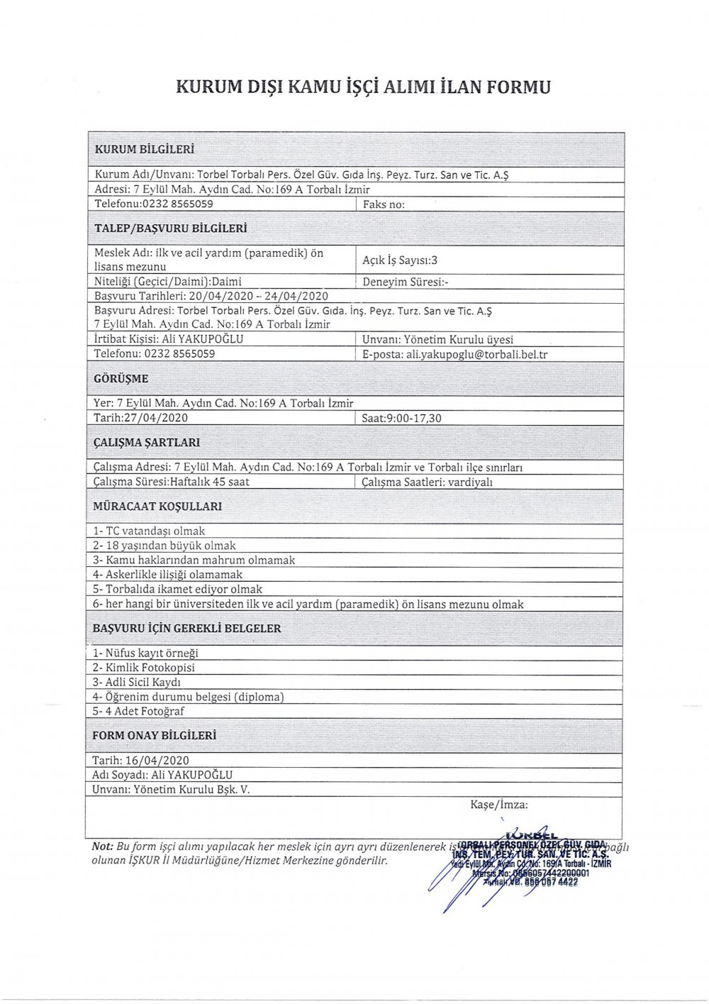 TORBEL tarafından İŞKUR’da açılan diğer Torbalı Belediyesi işçi alımı detayına göre; İzmir Torbalı Belediyesi’nde görevlendirilmek üzere, İlk ve acil yardım (paramedik) ön lisans mezunu 3 personel alımı yapılacak. 20 Nisan ile 24 Nisan arasında başvurular aynı adrese aynı başvuru belgeleri ile yapılabilecek. Aranan şartlar arasında; herhangi bir üniversiteden ilk ve acil yardım (paramedik) ön lisans mezunu olmak ve Torbalı sınırları içinde ikamet ediyor olmak kuralları var.