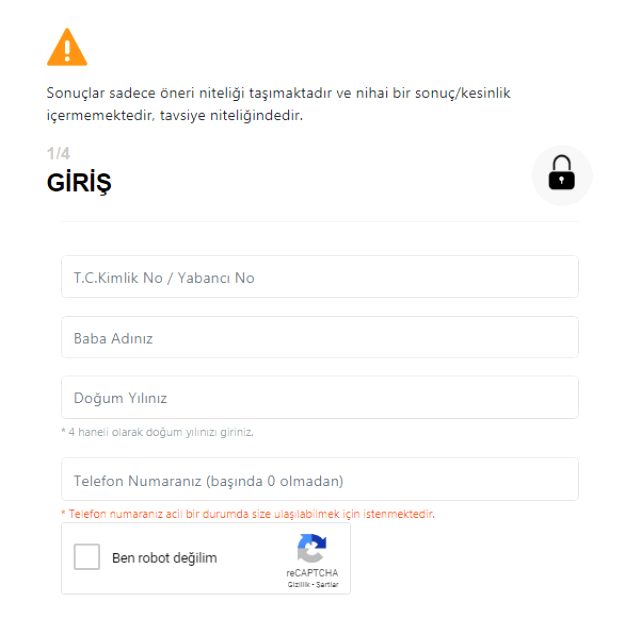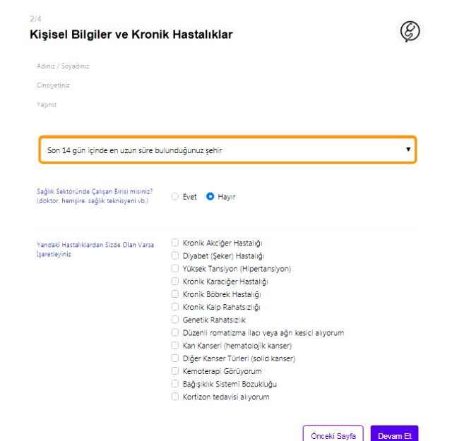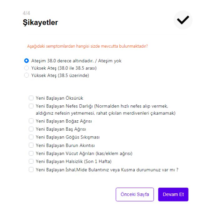 Koronavirüs testine başlamadan önce, “Sonuçlar sadece öneri niteliği taşımaktadır ve nihai bir sonuç/kesinlik içermemektedir, tavsiye niteliğindedir” uyarısı yer alıyor. İlk sayfada kişisel bilgilerin kaydedilmesinin ardından kişilerin karşısına sorular geliyor.