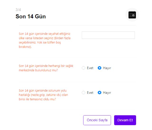 3 – Son 14 gün içerisinde seyahat ettiğiniz ülke varsa listeden seçiniz (Birden fazla seçebilirsiniz. Yok ise lütfen boş bırakınız).